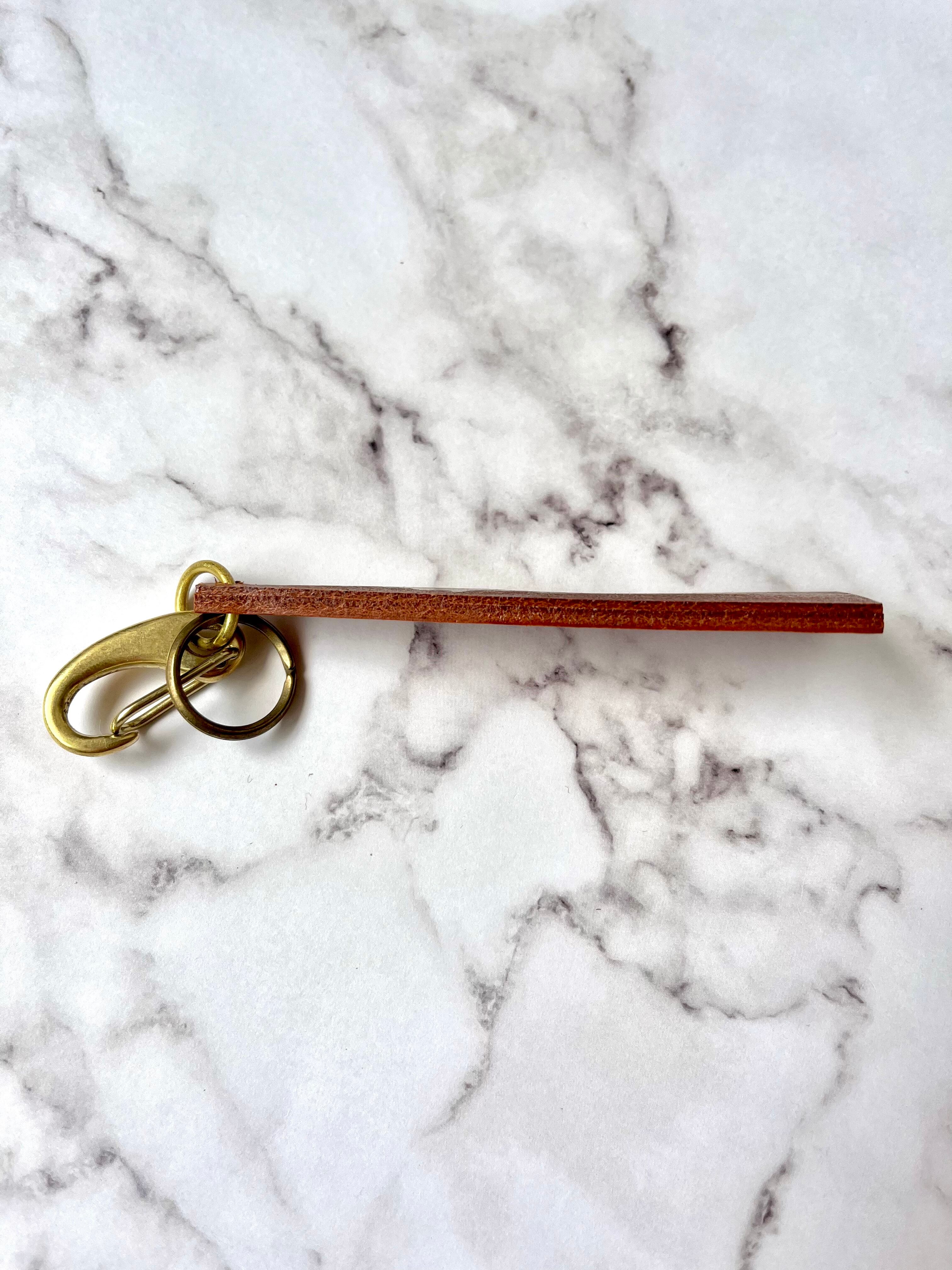 真鍮製のカラビナに二重リングとレザーチャームが付いた